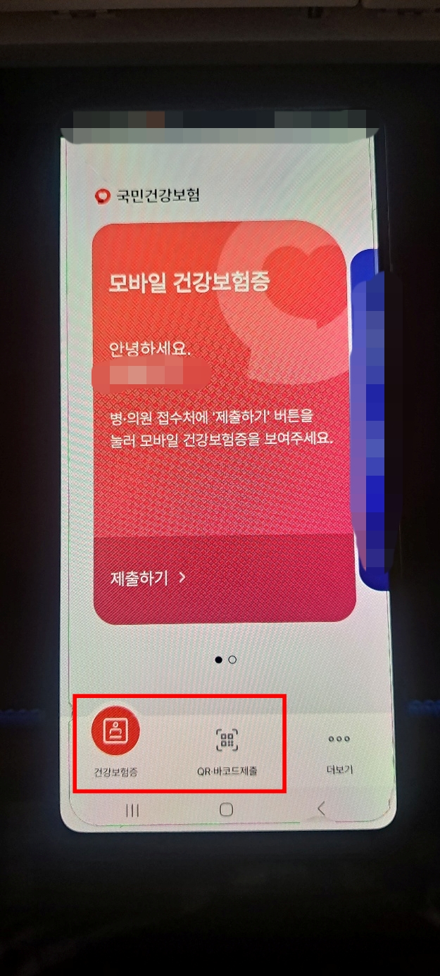 스마트폰 화면 하단에 보이는 건강보험증, 또는 QR 바코드 제출 중 하나를 선택해 손으로 터치하여 병원 관계자에게 보여주면 본인 확인 절차는 끝이 납니다.