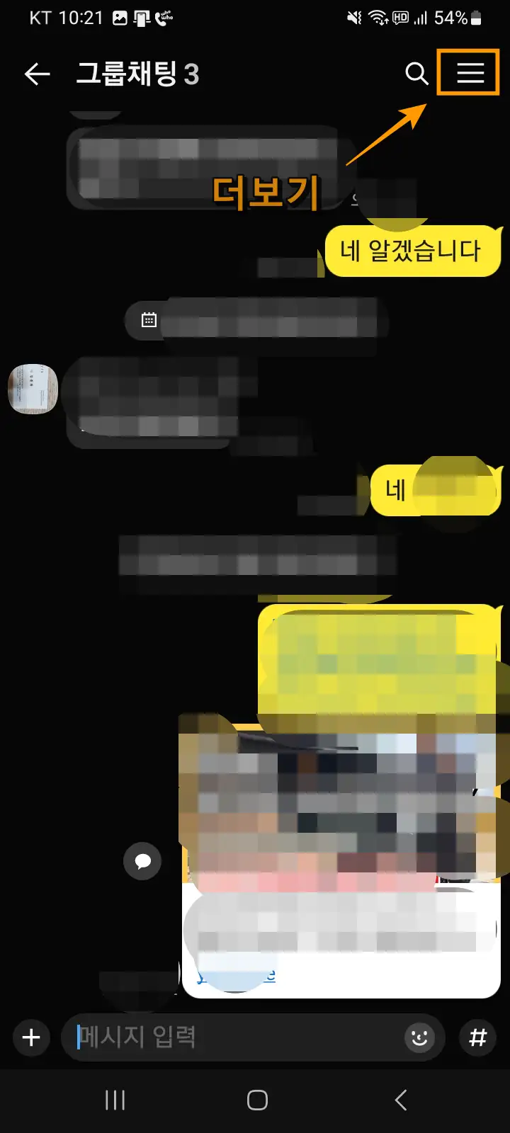 3. 화면 오른쪽 상단에 더 보기 아이콘(줄 세 개 모양)을 눌러 채팅방 서랍을 나오게 합니다.
